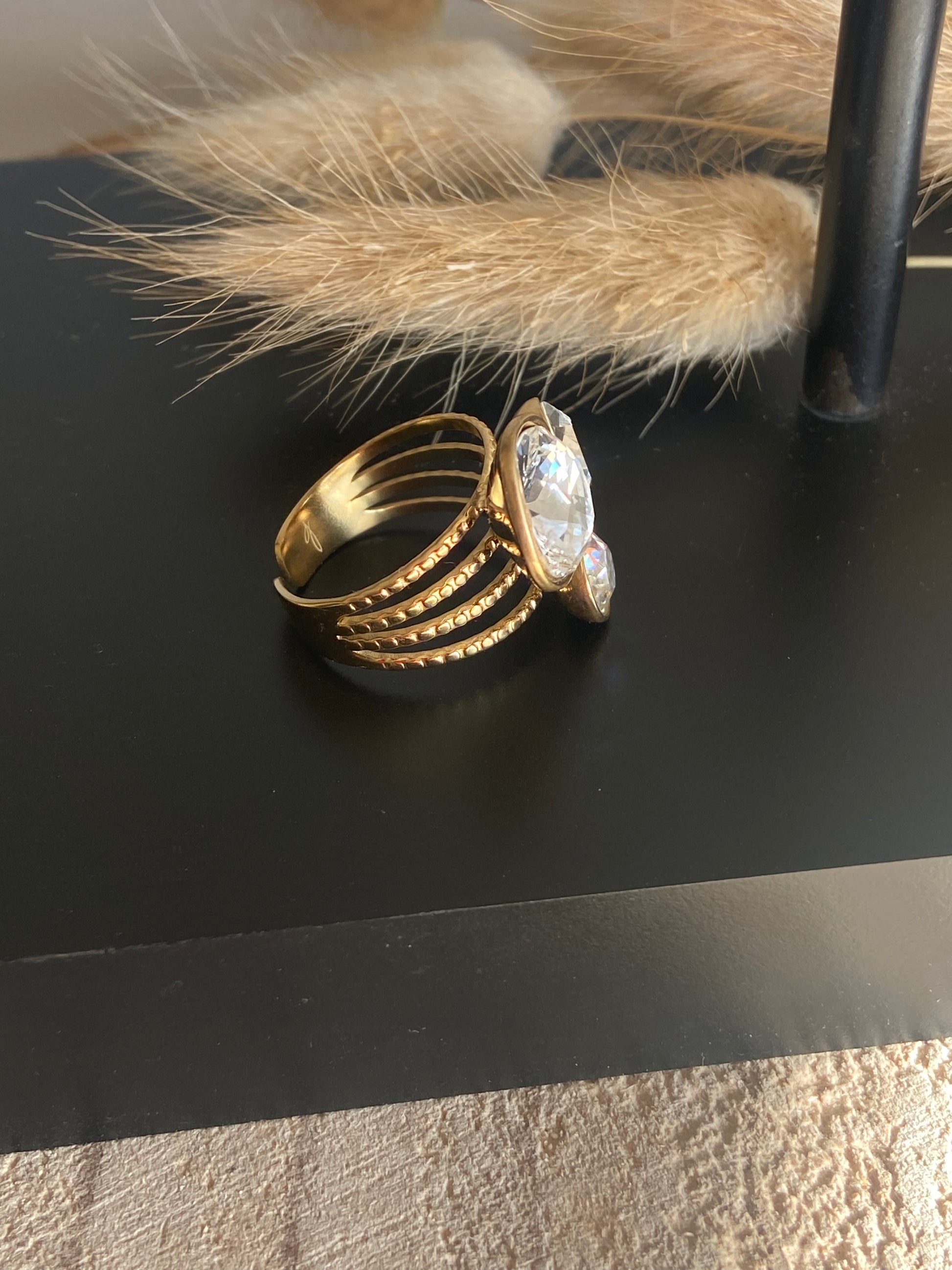 Bague en acier inoxydable composée de trois cristaux taillés.