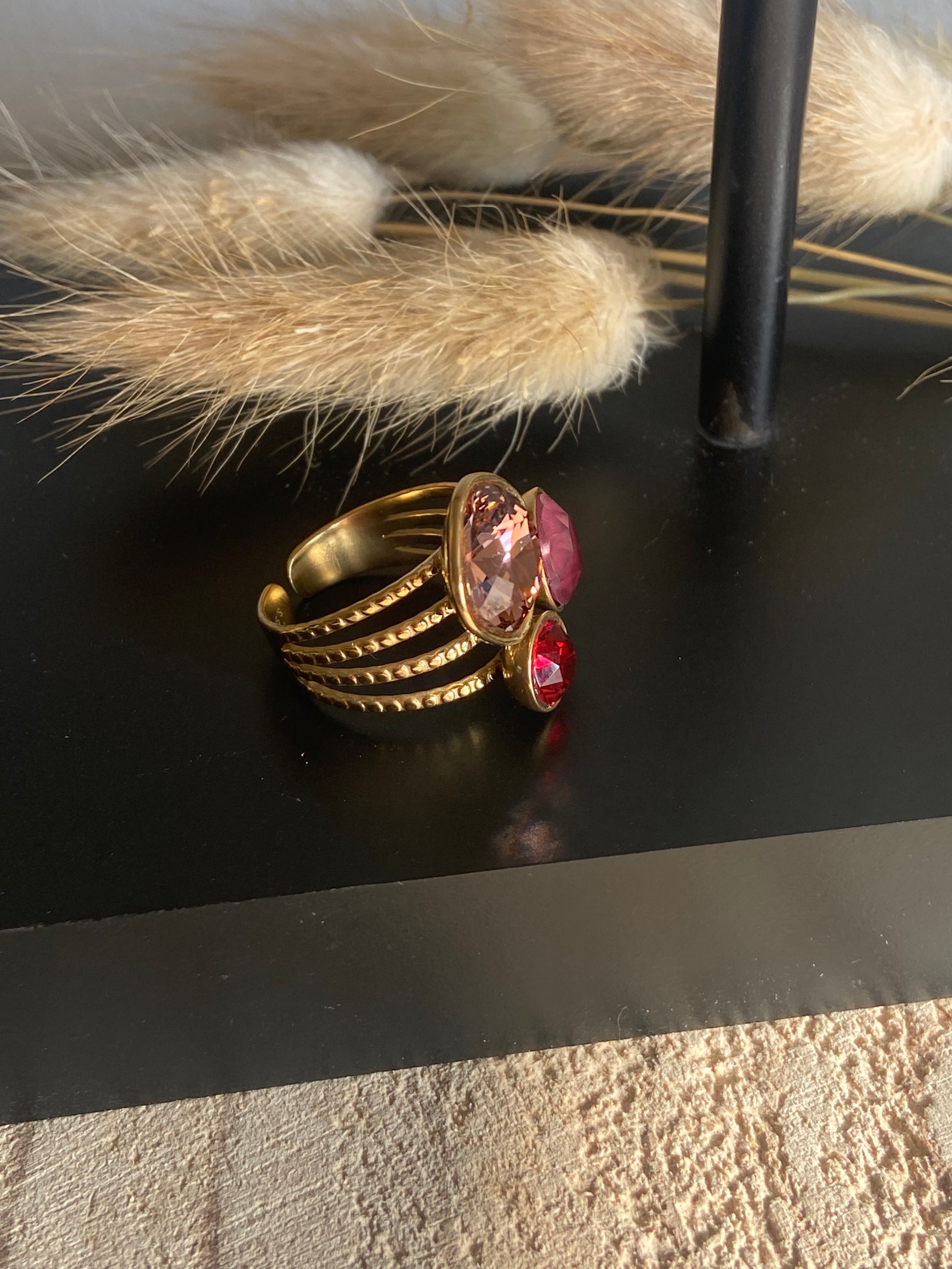 Bague en acier inoxydable composée de trois cristaux taillés.