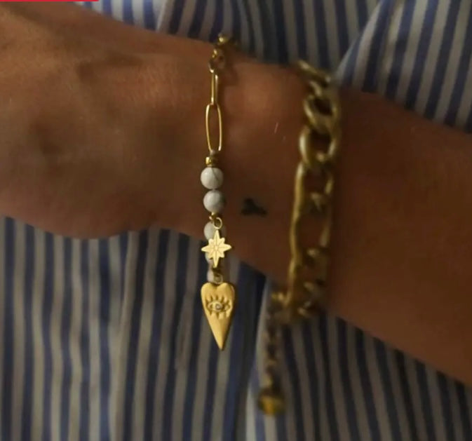 Magnifique bracelet acier pierre semi-précieuse pampille lune coeur fleur