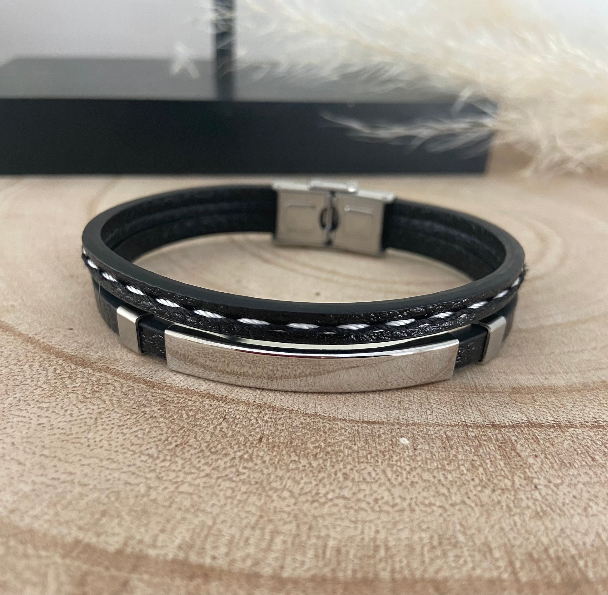 Il est fabriqué à partir d’acier inoxydable de cuir noir et d’une broderie en coton .