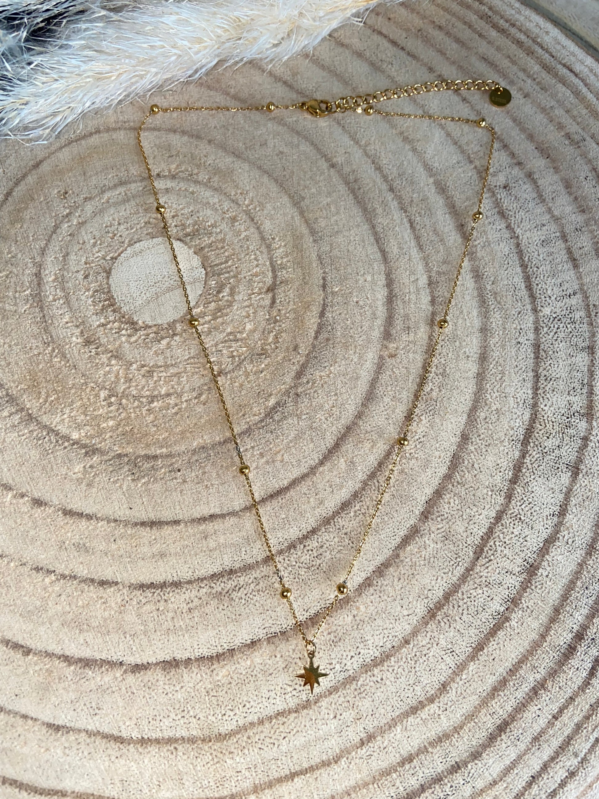 Collier en acier inoxydable avec une chaîne fine à billes qui présente un petit pendentif en forme d’étoile . Il se ferme grâce à un fermoir mousqueton, la longueur est réglable grâce à la petite chaînette de réglage de 5 cm .