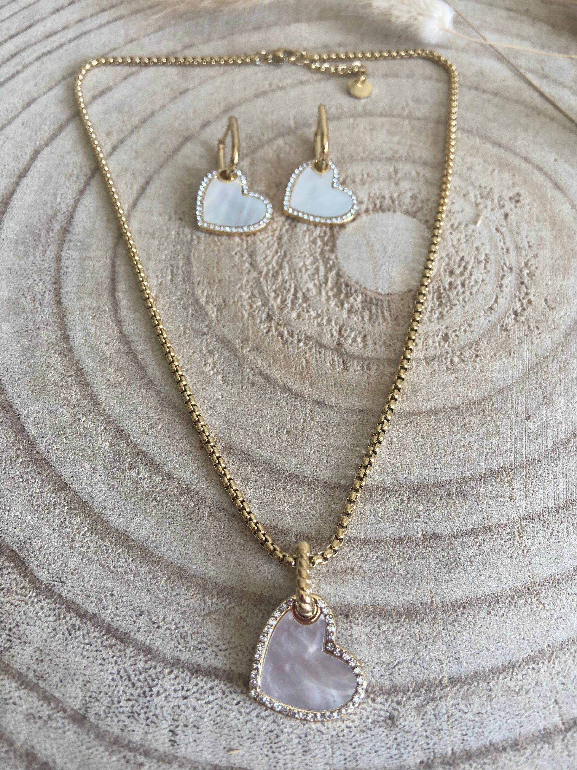 Collier ajustable Maille Vénitienne pendentif coeur pierre naturelle serti clos pavé de strass et suspendu par un anneau torsadé .