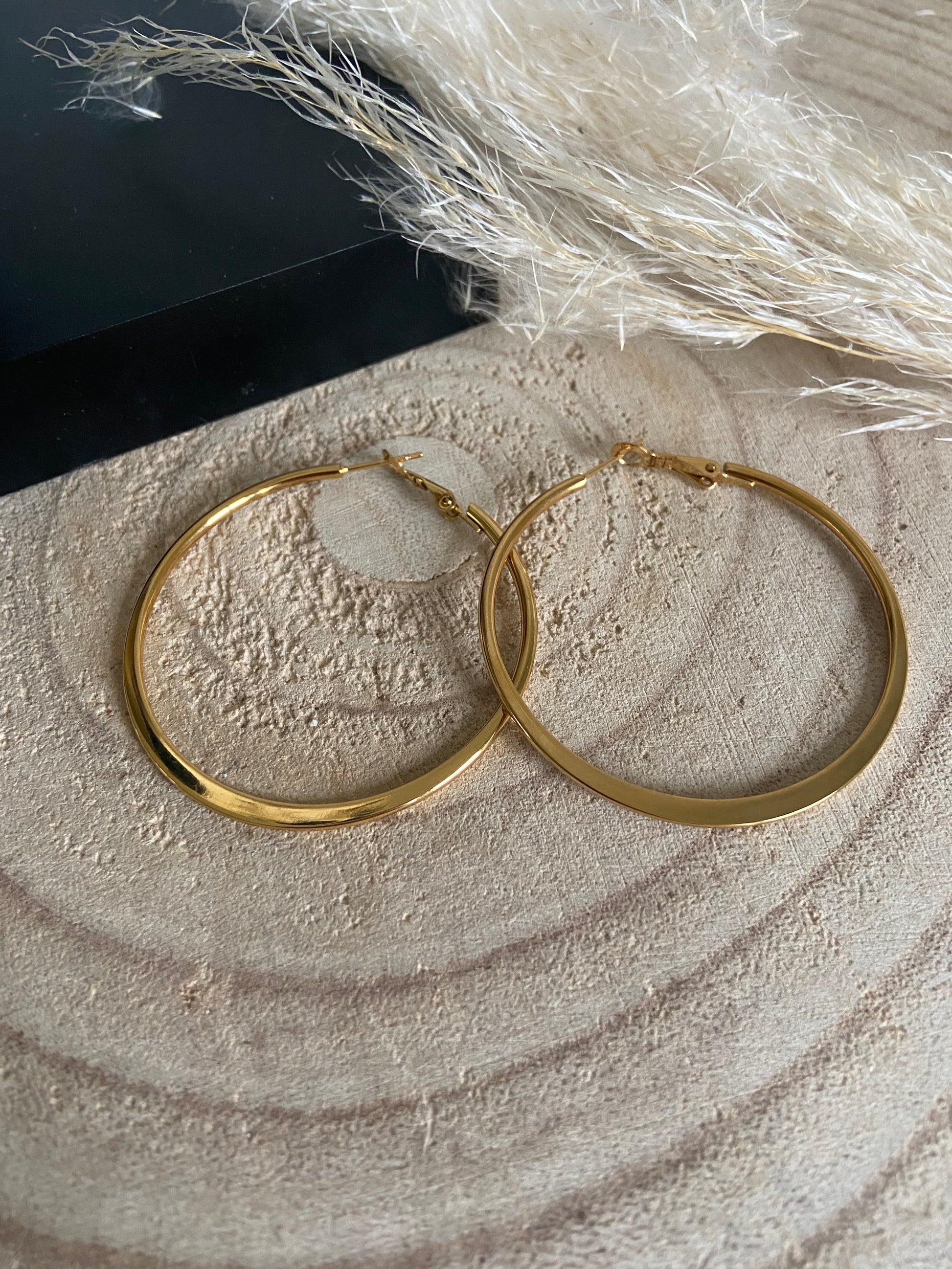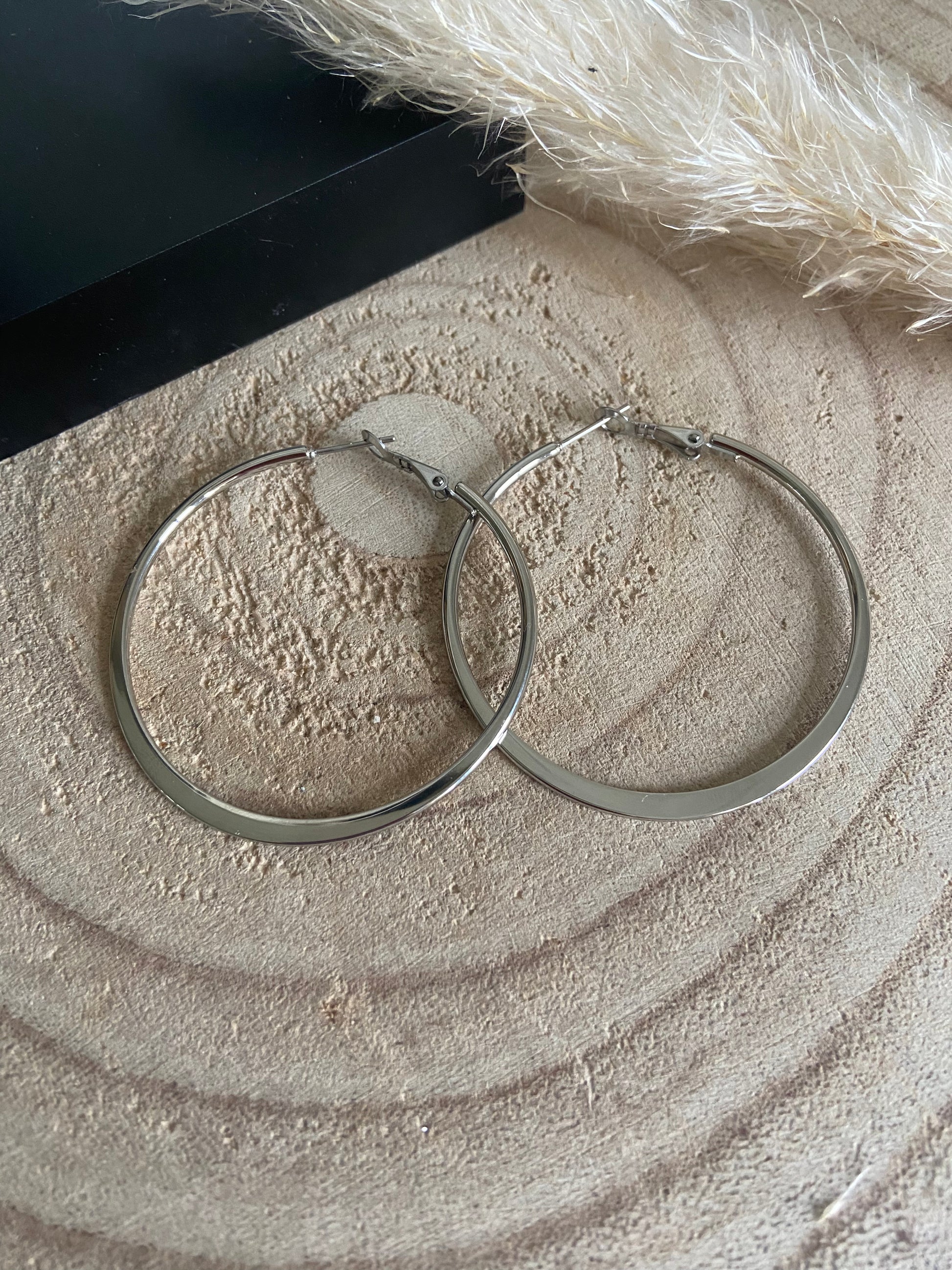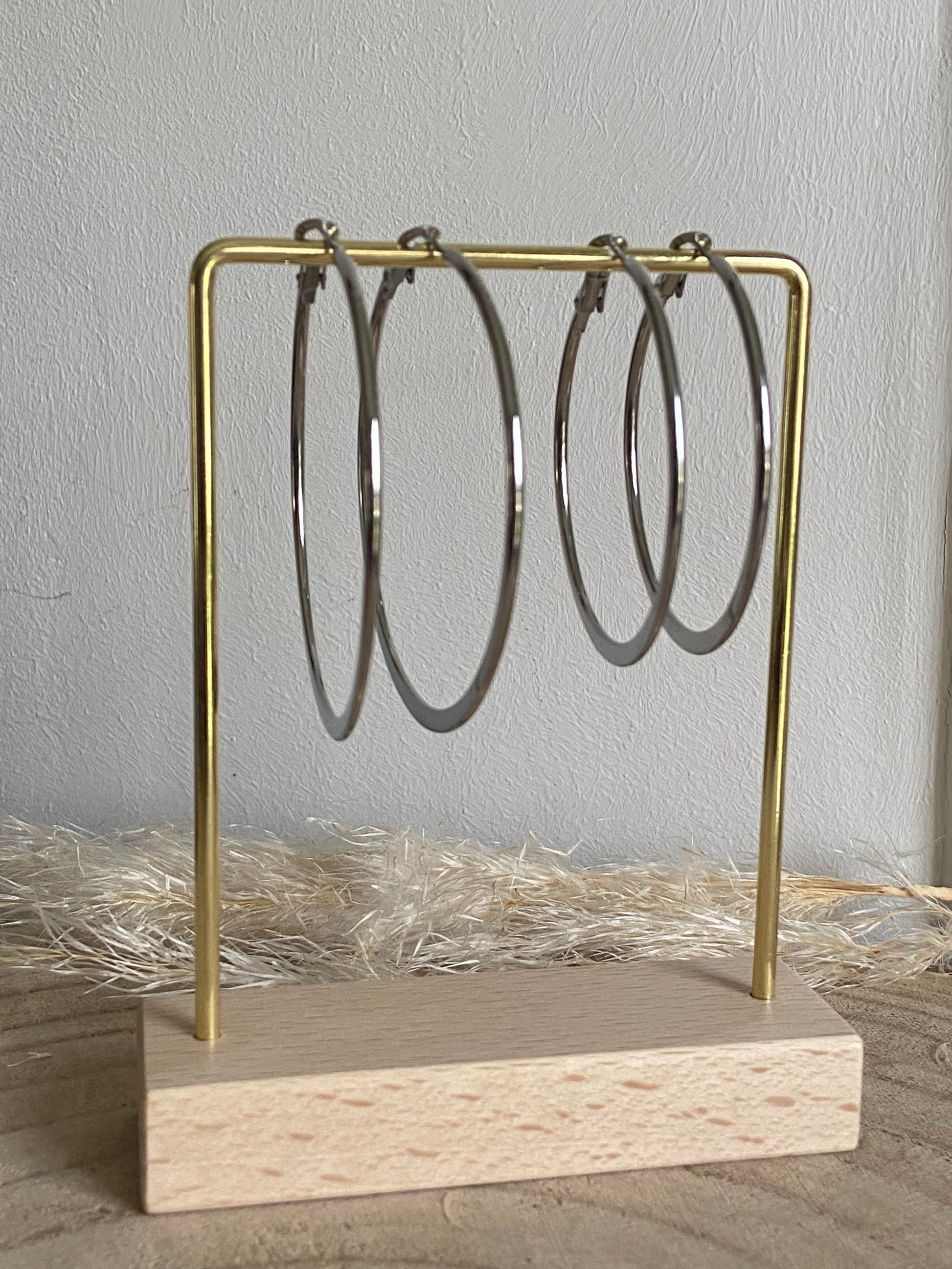 Boucles d’oreilles créoles cylindriques puis aplaties sur le bas, en acier inoxydable chirurgical 316L.